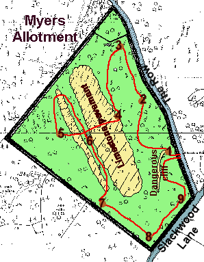 The red line on the map represents a butterfly transect. A transect is a fixed route along which walks are made. The transect is representative of the site, including elements of all the habitats. The Myers Allotment transect is split into 9 sections. The transect should be walked every week throughout the season. All butterflies of all species are recorded within a 5 metre corridor, (five metres on either side of the transect) for each of the nine sections.