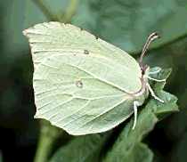 common name for a distinctive butterfly that is widely distributed throughout Europe, except in northern Scandinavia and Scotland, and ranges south to northern Africa and eastward to Japan. Males are bright yellow and females are greenish-white, and both sexes have small orange-red dots in the centre of each wing. The wings are distinctively shaped and present a leaf-like appearance when the butterfly settles on a twig or stem. They have a wingspan of 5.5 to 6.5 cm (2 in). An early English name for this insect was the “butter-coloured fly”, which is probably the source of the name “butterfly”.