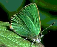 common name for any member of a group of butterflies belonging to the family Lycaenidae, which also includes the blues and coppers. Hairstreaks are usually quite small with wingspans ranging from 2.5 to 6 cm. The name “hairstreak” is derived from the fine pattern of lines on the undersides of the wings of most species. In the early days of butterfly study they were referred to simply as “streaks”. The uppersides of the wings are often brilliantly coloured, particularly in tropical species such as Hewitson’s blue hairstreak from South America. However, most species from temperate climates are less brightly coloured, although some, such as the green hairstreak from Europe, have an unusual metallic green colour to the undersides of the wings.