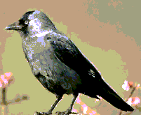 Jackdaw, common name for two birds of the crow family. The European jackdaw is about 33 cm (13 in) long. It is dark grey, blackest and glossiest on the head, back, wings, and tail, with a paler grey neck. The Daurian jackdaw, of eastern Asia, is similar but paler, with a more common colour phase in which the foreback, neck, and belly are white. Originally nesting in hollow trees or cliffs, jackdaws have adapted to urban life and nest on churches, castles, and other old buildings. Like other crows, they are omnivorous and noisy.
