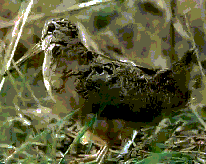The Eurasian woodcock has short, stout legs and averages about 34 cm (about 14 in) in length. The head is relatively large, with a long, straight bill. The dark, prominent eyes are set far back on the head. The woodcock is mostly brown, mottled with black, grey, and russet. The woodcock lives in woodland, where the soft, moist earth yields its favourite food, the earthworm. They nest on the ground in shallow depressions lined with moss and dry leaves. The female lays four greenish eggs with brown spots that are incubated by both parents for 26 to 28 days. The bird remains hidden by day, protected by its coloration.