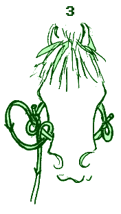 3. Thread the length of rope that you are holding through the loop furthest from you, passing under the ponies chin. Tie it off with a half hitch (?) or other non-slip knot.