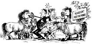 Over familiarity with visitors to the reserve may be something to be considered and is one possible disadvantage. The only problem we have experienced was with a filly who being fed titbits by a visitor decided to follow all the walkers. She still however, didn't present a danger to them just walked hopefully behind, although they sometimes became anxious and speeded up! More prominent anti-feeding notices solved the problem eventually. The feeding problem is still less of a danger to the public in handled stock than in an unhandled pony who has plucked up courage enough to grab a sandwich but is on his toes ready to bite or kick.