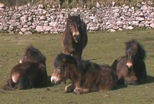 The theft risk is another possible disadvantage. However, this is only equal to all other grazing equines and brand marks or micro-chips, make the Exmoors less attractive to thieves. I was initially concerned about the sometimes heavy flow of walkers across the reserve and the safety issues of both people and humanised ponies. After keeping a careful eye on both, I feel now that well educated ponies are far less risk to general public on a small site than those with much stronger instinctive reactions. Although pony-people contact is probably not something to be encouraged, nevertheless I observed some quite rewarding scenes where ponies were behaving impeccably just politely socialising. On one occasion we saw a walker lying asleep in the sun, a book covering his face with a pony standing right next to him, also dosing. The ponies also began to form opinions as to which were the 'O.K'. people. On the busy sites they remained relaxed even with loud children with 'guns', toy tractors, push chairs etc. in the close vicinity. Mysteriously, they stayed calmly positive towards handicapped groups of visitors behaving in an unusual way. Noisy adults and loud adolescent boys (however harmless) they scuttled away from.