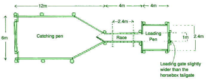 Handling pen suitable for a small herd of unhandled Exmoors, as used by English Nature at Aqualate Mere in Staffordshire. The design is based on the Exmoor National Park pen at Haddon Hill. The helpful advice of Ian Stuart-Lyon is acknowledged.